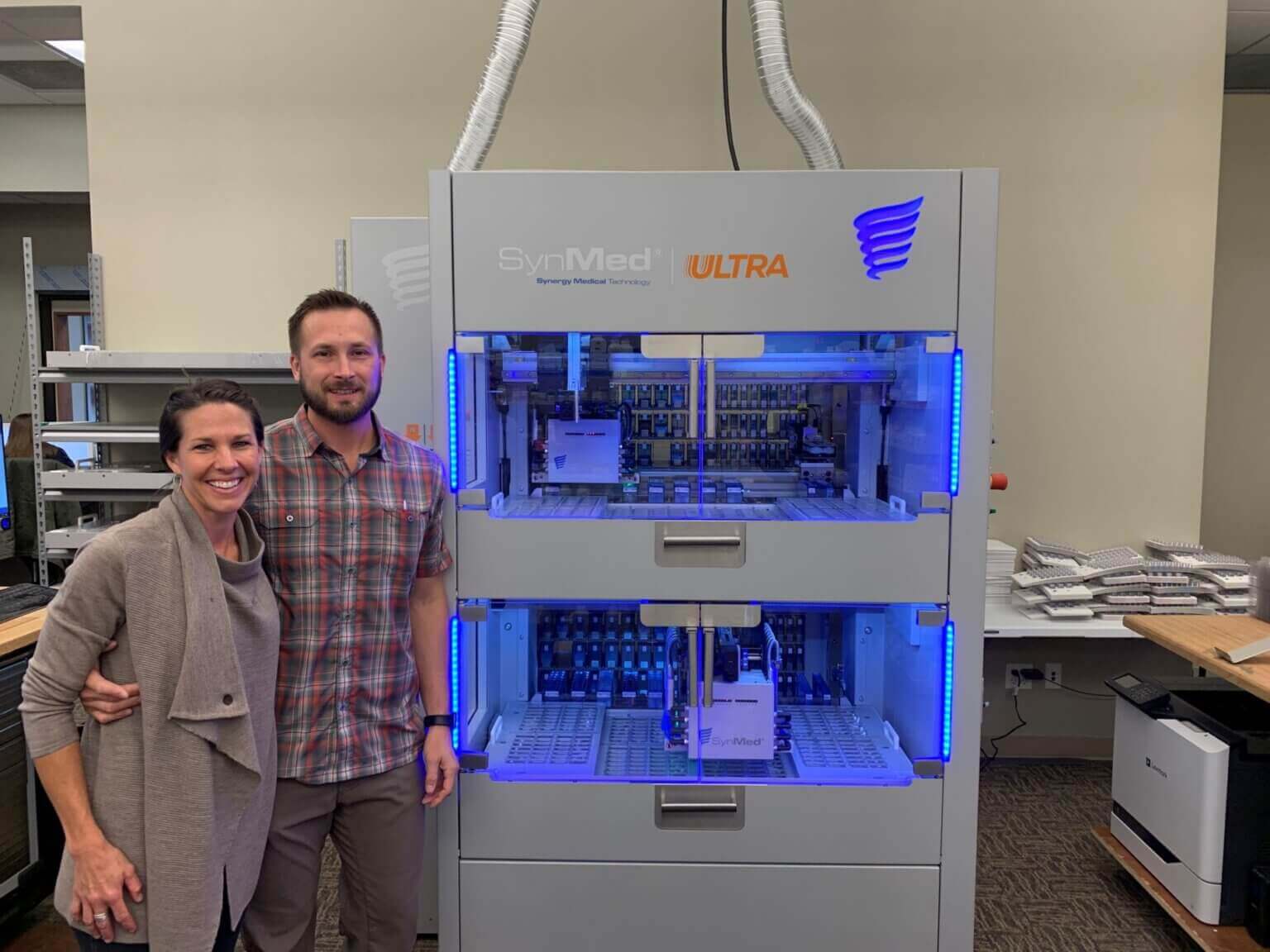 Matt and Abby Mills, Big Sky Managed Care, in front of their prescription sorting and packaging robot – one of just 30 worldwide.